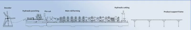 Macchina svolgitrice → Mandrino di formatura → Sistema idraulico → Sistema di controllo automatico → Meccanismo di formatura passo-passo → Meccanismo di cesoiatura automatico → Tavolo di ricezione del prodotto finito. I processi principali includono la punzonatura idraulica e il taglio idraulico.